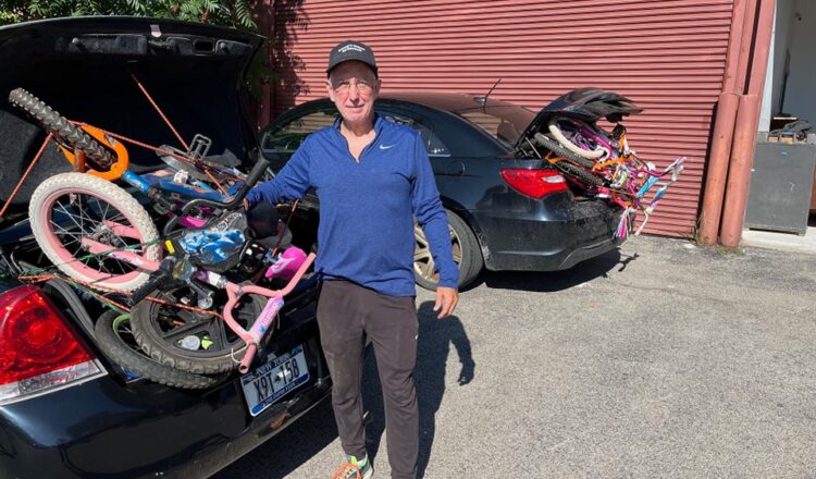 Larry Pelkey lives in Hornell and gives away free bicycles to area residents. His non-profit is called Larry’s Bikes of Hornell, and he does everything himself. He stores the bikes (both unrepaired and ready-to-go) inside his house including in the former bedrooms. Each year, he gives away 350 – 400 bikes and has given away almost 1100 since October 2021. The majority of the bikes he gives away are for kids, and he picked up 26 unrepaired kid bikes from the Flint warehouse on Tuesday. He and his sister loaded them carefully into their two sedans, and he would’ve taken more if they’d fit. Besides filling the trunks to overflowing, they also squeezed bikes into the cars’ back seats and front passenger seats. R Community Bikes has a surplus of kids bikes and was happy to give these bikes to Larry.