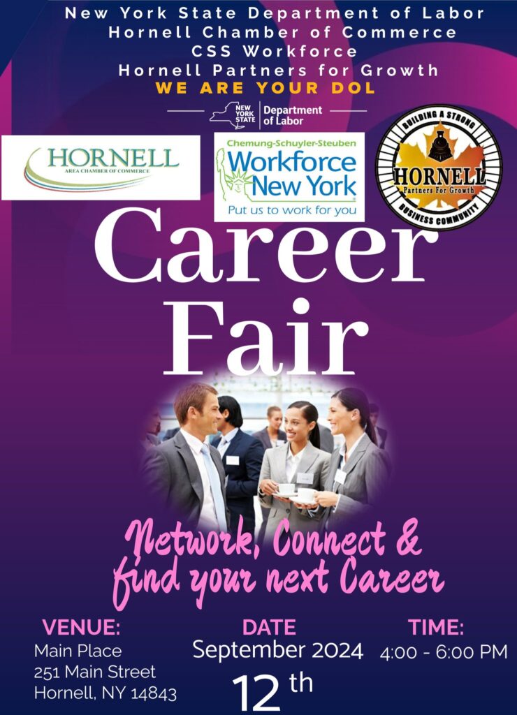 Hornell, NY – The New York State Department of Labor, Hornell Partners for Growth, CSS Workforce, and the Hornell Chamber of Commerce are teaming up to host a Career Fair on September 12th from 4:00 to 6:00 PM at The Main Place on Main Street in Hornell.