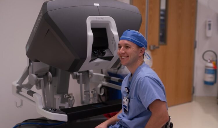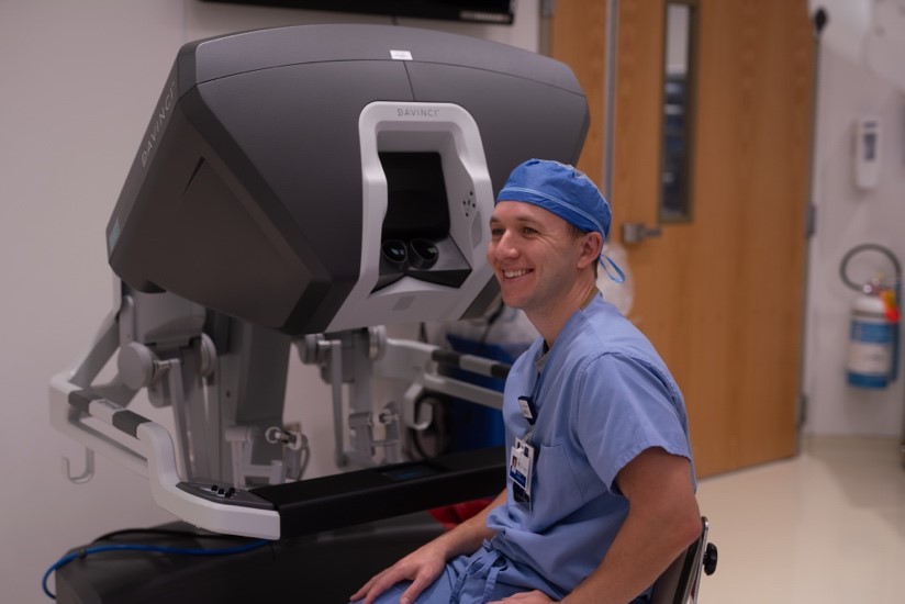 St. James Hospital General Surgeon Timothy Reidlinger, MD, next to the surgeon’s console of the da Vinci surgical system