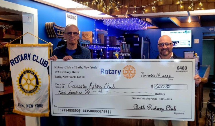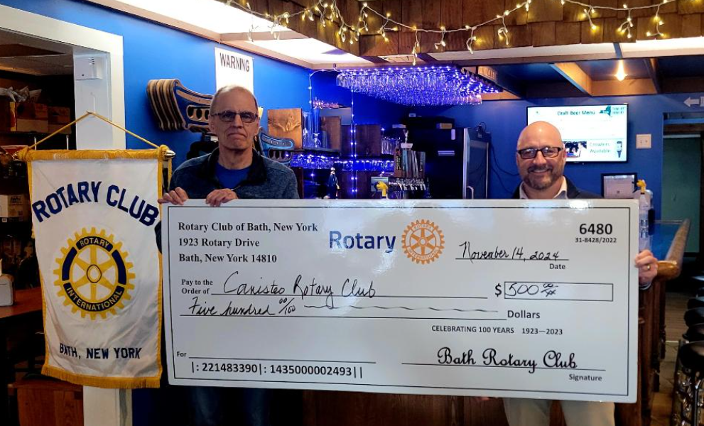 “I am proud to call the Village of Bath my home now, but I am equally proud to be from the resilient Canisteo Valley. Time and time again this valley has shown its strength and its heart. We do not shrink in the face of adversity. We rise above it,” remarked Eddie VanStine, Bath Rotary Club President-Elect and a former resident of Canisteo. “This small token of support from the Bath Rotary Club is far more than a monetary gesture – it is a symbol. A symbol of unity, compassion, and the unwavering belief that we stand strongest when we stand together. Supporting our neighbors is not just an act of kindness; it is our way of life. Together we will rebuild, heal, and show the world the true meaning of community. I personally am pleased that I have been able to help Canisteo residents with cleanup and have been directing them to the resources they need for certain situations.