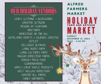 If you are looking for last-minute unique, locally made gifts, you won’t want to miss the Alfred Farmers Market Holiday Farm and Artisan Market on Sunday, December 15th. The market will be held at the UCC Church Center in Alfred from 11:00 am to 3:00 pm.