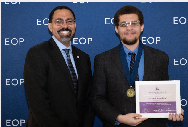Al-Aqib Coulibaly pictured with SUNY Chancellor John B. King Jr. when receiving the Norman R. McConney Jr. Award for Student Excellence
