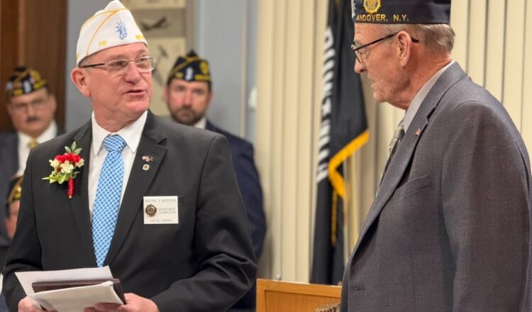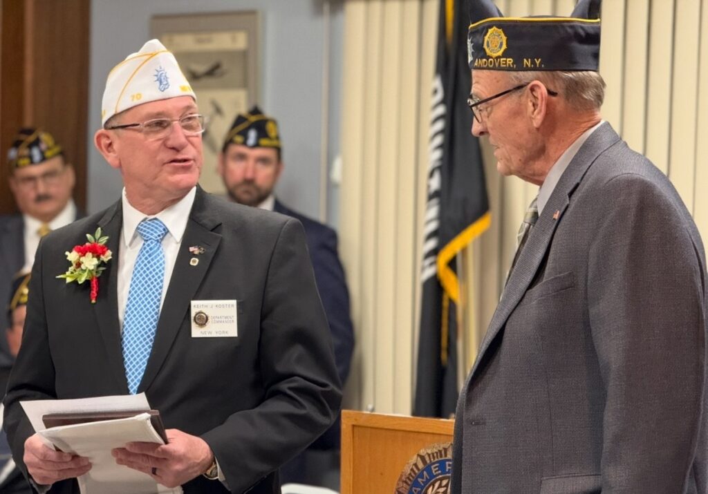 (Cutline: New York State American Legion Department Commander Keith Koster tells Andover’s Fred L. Kelley Jr., “You have performed one of the most sacred duties entrusted to our Legion family — honoring deceased veterans with dignity and respect.” John Anderson photo)