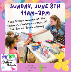 The Alfred Farmers Market returns for its thirteenth regular season on Sunday, June 8, with a festive celebration of families and children, The Market Sprouts Festival. The youngest market goers, the “market sprouts,” can go shopping with complimentary “Sprout Bucks,” have a balloon creature made for them, follow a story trail through the market, and plant seeds in the Activities Tent. This year, the AFM has partnered with the Alfred Box of Books Library to provide a wide range of family activities, including Mandy’s Balloon Animals.
