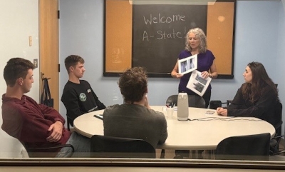 Gorman said she brought her class to tour the facility in Alfred University’s Olin Building—which includes the focus group room, a studio for producing podcasts, and a study area—at the invitation of Shelly Freyn, associate professor of marketing at Alfred University.