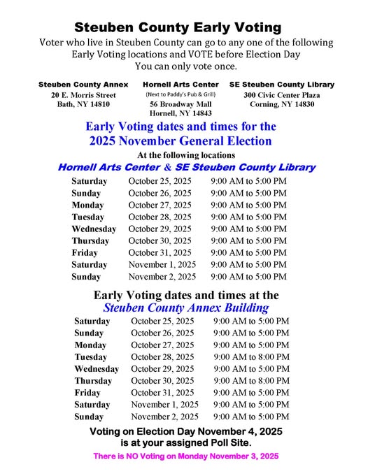 Early voting begins Saturday, October 25 at the Hornell Community Arts Center, located at 56 Broadway Mall, from 9 a.m. to 5 p.m. Early voting will continue daily through November 2 at this location. All City of Hornell voters will vote at this site.