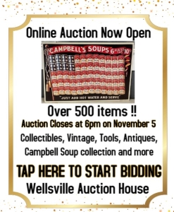 This is an Online Auction which is open for bidding and will begin soft closing on Wednesday Nov. 5th, 2025 at 6 PM EST. Visit the Online Auction here to register and bid. Collectibles, Vintage, Tools, Antiques, Campbell Soup collection and more.