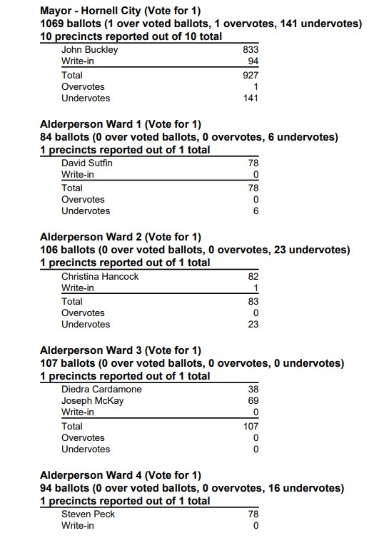 In Ward 3, Dr. Joseph McKay recieved almost twice the votes of Democratic challenger Diedre Cardamone. Chairman of the Hornell Democratic Committee John Bradley challenged Alderwoman Lita Brown in Ward 6 but was no successful. In Ward 7, incumbent Kevin Valentine won easily over Deomcrat Okeena Gadsden.