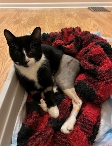 The bag was found with a broken cat inside and rushed to veterinary care with the HAHS. The loving volunteers named him “Mister,” and sent him off to Cornell University for intense treatment.