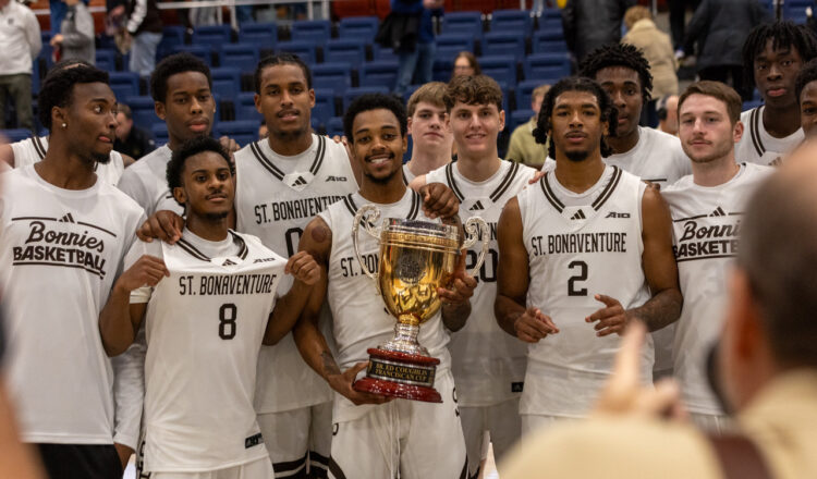 Photo: The St. Bonaventure men’s basketball team celebrates winning (and retaining) the Franciscan Cup. Photo by STEVE HARRISON/Sun, see Steve’s slideshow of photos after Chuck Pollock’s column)
