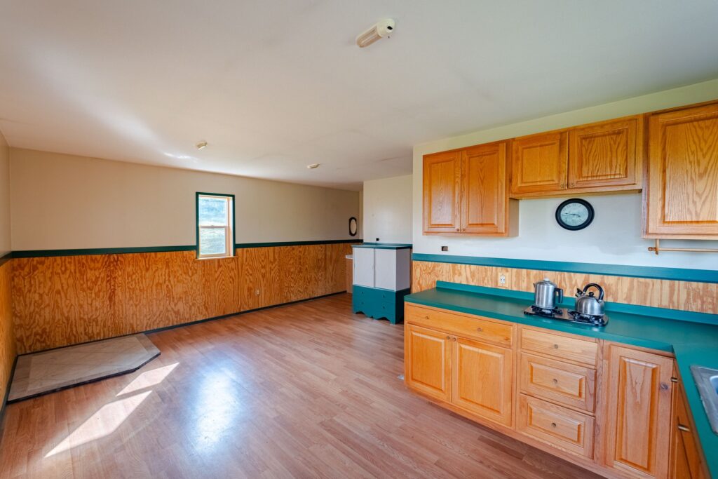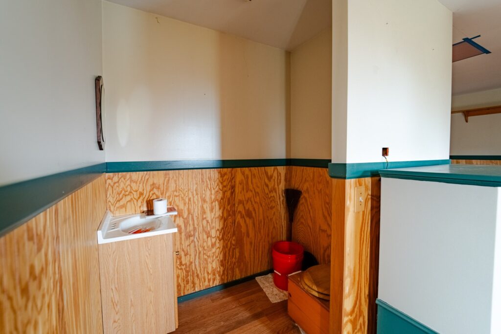 The cabin space is an open floor plan with a kitchen, a large space for a dining room or living space including a ceramic tile hearth pad in one corner for future heating installation if so desired. Turning the corner you’ll find the open bedroom area along with a walled-off bathroom location. This cabin features a fully off-grid setup for zero utility bills, however there is power available a short distance to the paved road. Current power is supplied via wind turbine and battery charging system located in the garage attached to the main cabin. This space also holds the battery bank system, on demand hot water tank, and outdoor shower area.