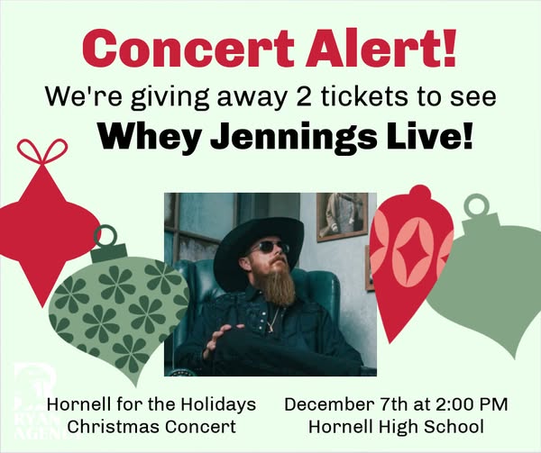 The Ryan Agency is giving away 2 tickets to see Whey Jennings live at the Hornell for the Holidays Christmas Concert on December 7th at 2:00 PM at Hornell High School! Don’t miss your chance to experience an unforgettable performance featuring Whey Jennings and the Hornell High School Choir.
