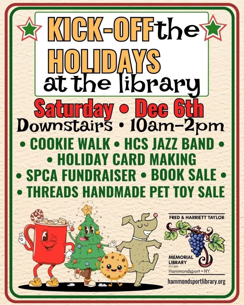 The Fred & Harriett Taylor Memorial Library invites the community to Kick Off the Holidays on Saturday, December 6th from 10am–2pm downstairs at the library. Guests can enjoy a festive 🍪 Cookie Walk, lively music from the 🎷 HCS Jazz Band, hands-on 🎨 holiday card making, an 🐾 SPCA fundraiser, a 📚 book sale, and 🧵 handmade pet toys from Threads. It’s a cheerful celebration filled with treats, creativity, and holiday spirit for all ages!