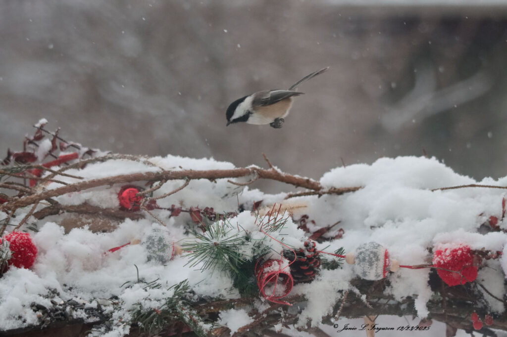 Then a delightful view of the Cole’s field and barn, and I’m ending today with a black-capped chickadee coming in for a landing.