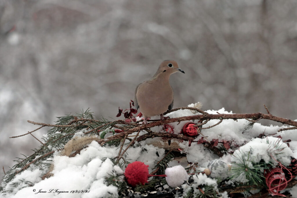 I begin this week with a snow covered, icy Canisteo river looking down stream with some pops of red in view, and a charming mourning dove a-top my bird feeders.