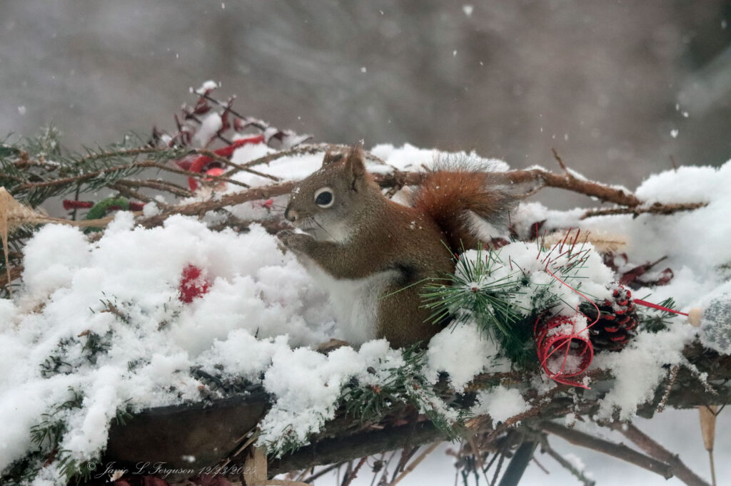 Next, another icy Canisteo river view with a red house across the river that you can see, and a spry squirrel eating sunflower seeds.