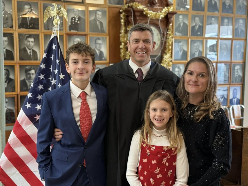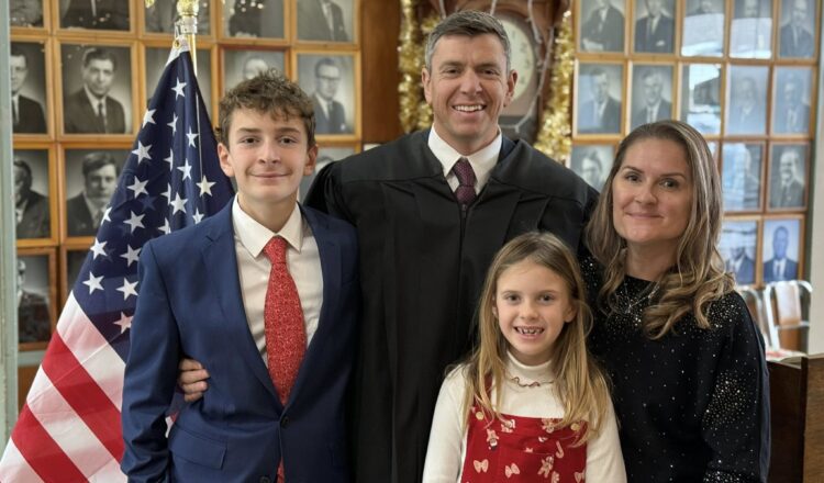 (Photo: From left, Allegany County Court Judge Ian M. Jones flanked by his family, son Avery, daughter Ada, and his wife, Chelsea)