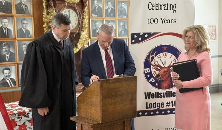 (In the photo: New Allegany County District Attorney Peter Degnan signs the paperwork making his position official as his wife, Amy holds the Bible from the swearing in. Ian M. Jones, the former D.A., on the left, conducted the swearing in moments after becoming the new Allegany County Court Judge.