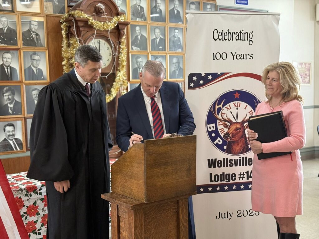 (In the photo: New Allegany County District Attorney Peter Degnan signs the paperwork making his position official as his wife, Amy holds the Bible from the swearing in. Ian M. Jones, the former D.A., on the left, conducted the swearing in moments after becoming the new Allegany County Court Judge.
