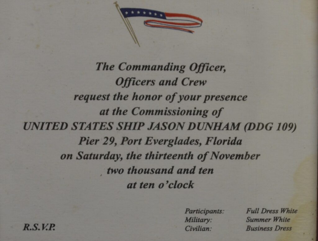 On November 13, 2010 the USS Jason Dunham was commissioned at Port Everglades in Florida between Fort Lauderdale and Miami. I was literally aboard via an invitation from the officers and crew.