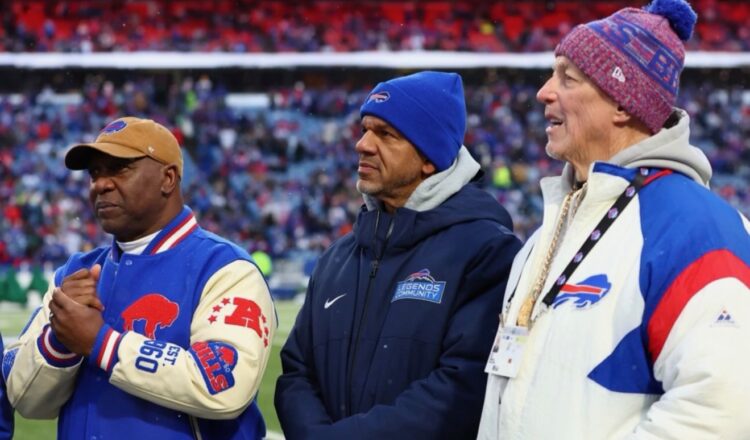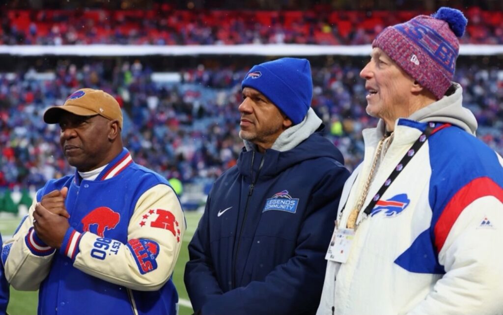(In the photo: Thurman Thomas, Andre Reed and Jim Kelly, three of Eric Jones’ idols as a child, enjoying one last moment at Highmark Stadium. Reed and Kelly visited Jones’ work before the game outside the stadium. Photo courtesy the Thomas family)