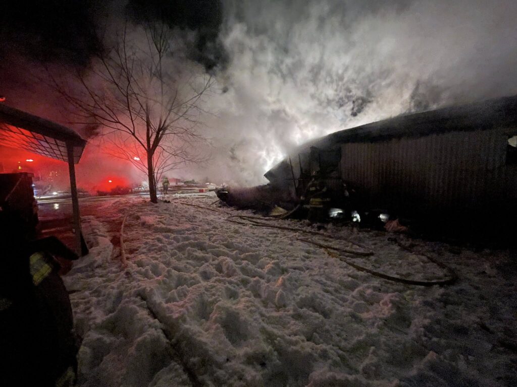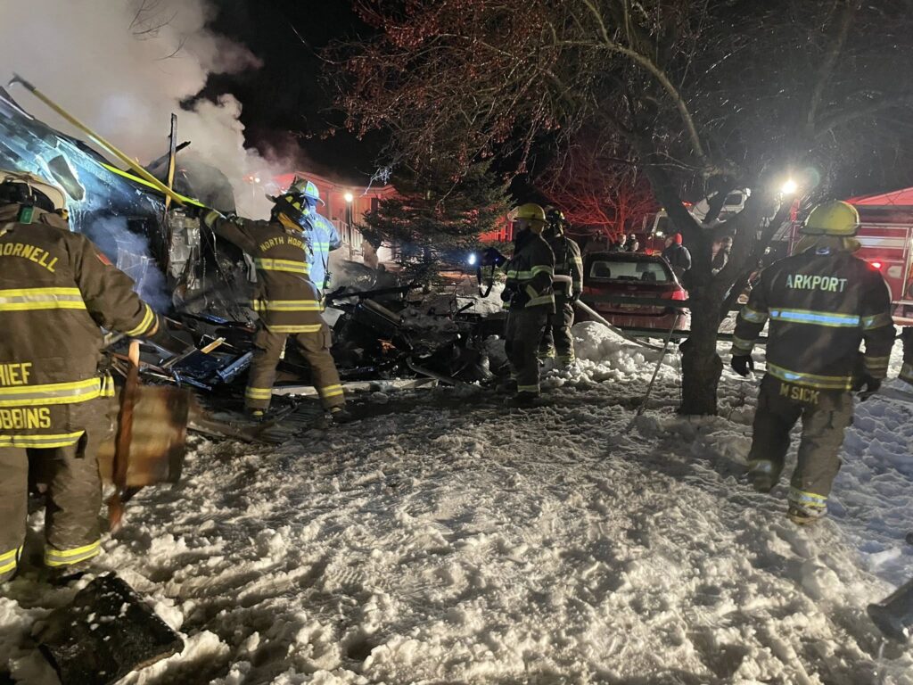 On Tuesday 2/3/26 at 9:16pm we were dispatched to 4 Hidden Lane in the village for the reported structure fire. Trailer fire with flames showing. North Hornell Volunteer Fire Department was auto dispatched for mutual aid and City of Hornell Fire Department for an ambulance. Canaseraga Fire Company was asked for immediately as the flames were visible from the parking lot at the firehall. North Hornell’s engine was requested to hit the hydrant across the street before entering the park. Unfortunately the home was a total loss. No injuries to any fireman or the resident. Minor damage to a nearby car. New York State Police were also on scene as well NYSEG and National Fuel to secure the utilities. Village of Arkport DPW also came to salt after the call. The investigation for cause was turned over to Steuben County Emergency Services.