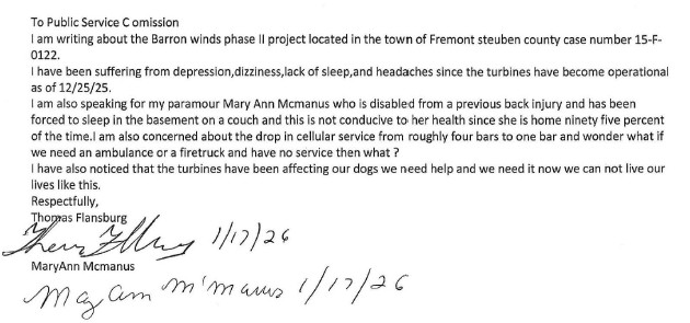 Fremont residents like Tom Flansburg and his partner, Mary McManus say their health has been affected by wind turbine sickness in the Village of Fremont since late December, when the newly-built Baron Winds LLC wind farm became operational.