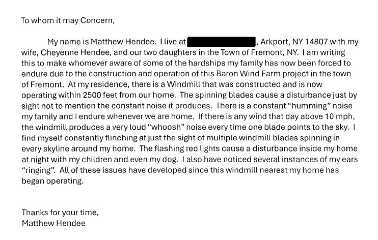 Baron Winds has also conducted extensive sound and flicker analyses as part of the Article 10 process, and those documents are all publicly available. The project is in compliance with all testing requirements and regulations under Article 10 and will adhere to all state regulations and permit conditions throughout the lifetime of the project. We are committed to addressing any community concerns and encourage anyone experiencing issues to utilize our established hotline phone number or email. We have followed up with each of the individuals who have submitted complaints and are working to gather additional information and address their concerns, consistent with our protocol.”