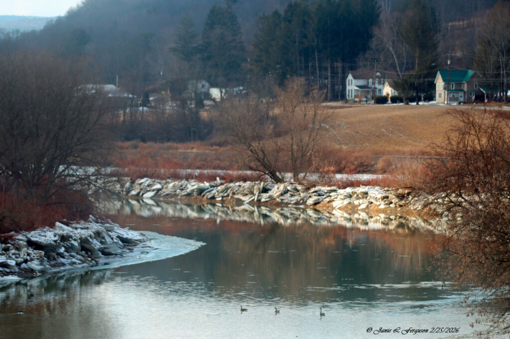 I begin this week with a vibrant male cardinal, who is known for his aggressive behaviour to protect his territory, and a steady NS train greeting us as it passes through our valley, along with signs that we had an ice jam on the banks of the Canisteo River, as well.