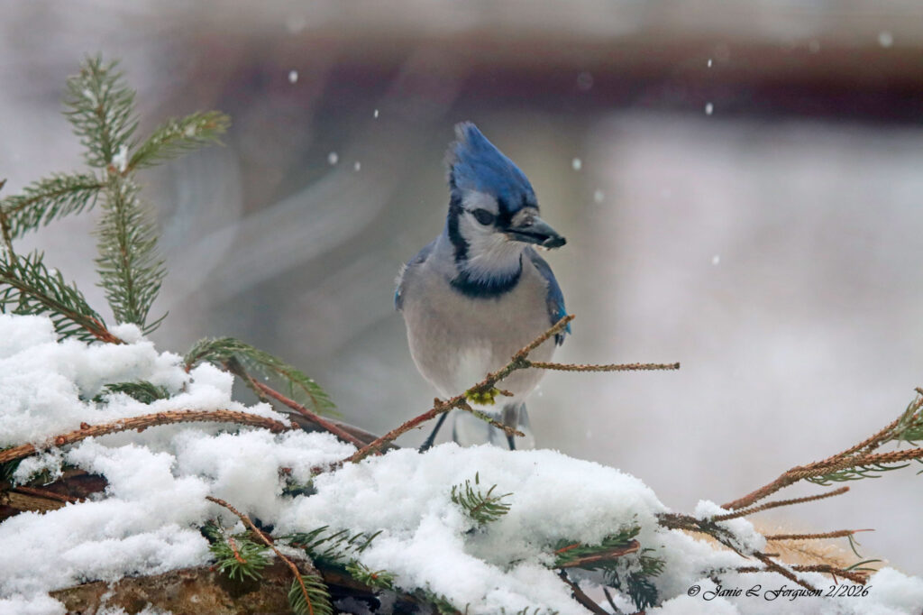 Next a noisy blue jay in the snow, They are so smart that they can mimic a hawk, and warn other birds to flee, before they become lunch, and several common merganser ducks, enjoying a swim with the anchored ice in view.