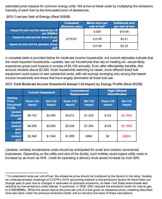 This morning a document from the NYS Energy Research and Development Authority sent to State Operations Manager Jackie Bray titled, “Likely Costs of CLCPA Compliance.” The report detailed that prices will increase through 2031 creating “high burdens” for households and businesses unless the plan in place now is modified.