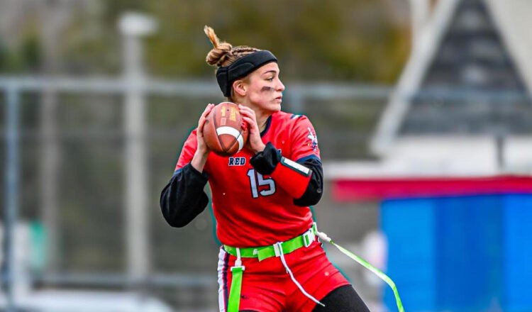 Senior Adela Kaletova, an exchange student, scored a touchdown when she caught an 11-yard pass from Eviningham. Senior Mia Nasca had the extra point for a 21-7 lead.