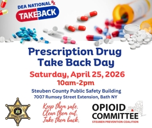 On Saturday, April 25, from 10 AM to 2 PM, the Steuben County Sheriff’s Office and the Steuben Prevention Coalition Opioid Committee will host the DEA’s National Prescription Drug Take Back Day at the Public Safety Building in Bath, NY. During this event, the DEA and its partners will collect tablets, capsules, patches, and other solid forms of prescription drugs. However, please do not bring needles, syringes, or lancets for disposal. These items can be disposed of at a general hospital, a residential healthcare facility (please call first), or through a mail-order take-back program.