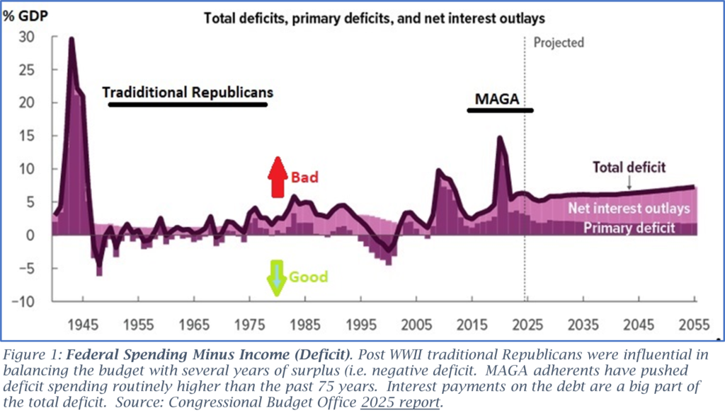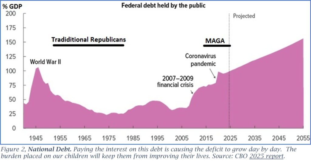 Traditional Republicans participated in three decades of managing balanced budgets for an economy that boomed and raised the standard of living and sense of wellbeing for nearly all Americans, and simultaneously reduced the national debt. MAGA promises the same but is delivering the opposite.