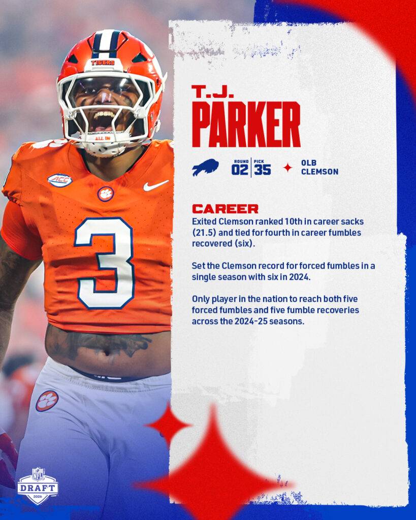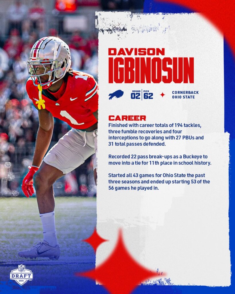 In the second round the Bills took edge rusher TJ Parker from Clemson, 6-foot-3, 265 pounds. Their third choice was cornerback Davison Igbinosun, 6-2, 195 from Ohio State, verifying the Bills focus on defense.